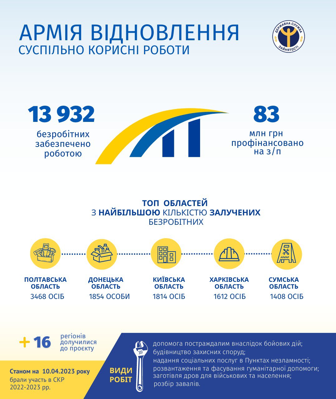 В Україні зараз дві армії: одна захищає нашу державу на воєнному фронті, інша - працює на економічному. І всі ті, хто своєю працею також наближають нашу перемогу, складають “Армію відновлення”. Люди, які з різних причин залишились зараз без роботи, можуть долучитись до цієї “армії” шляхом виконання суспільно корисних робіт з відбудови країни.