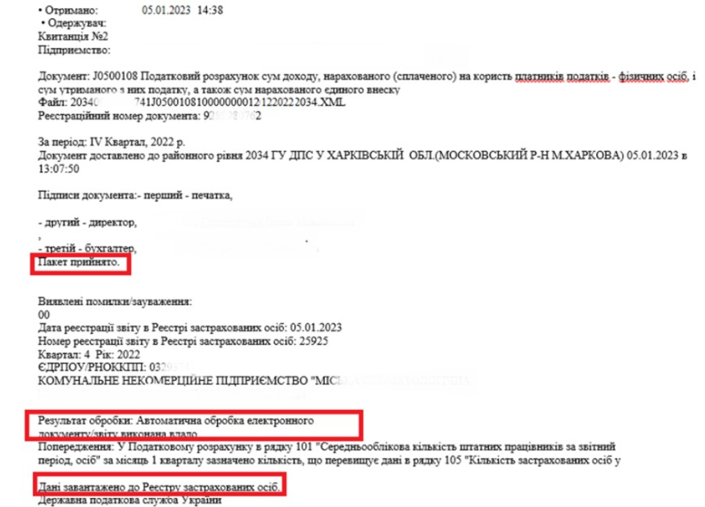 Останнім часом під час подання нової форми звітності J/F0500108 «Податковий розрахунок сум доходу, нарахованого (сплаченого) на користь платників податків – фізичних осіб, і сум утриманого з них податку, а також сум нарахованого єдиного внеску» за 4 квартал 2022 року деякі користувачі зіткнулися з проблемою тривалої обробки звітності у контролюючому органі та в подальшому отриманням квитанції №2, яка містить в тексті значення «:)».