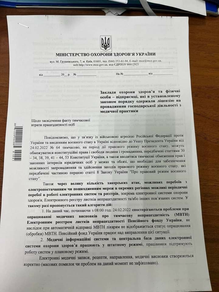 Міністерство охорони здоров'я України у листі, розміщеному нижче, повідомляє, що можливі затримки та перебої в роботі Електронного реєстру листків непрацездатності та з оформленням медичних висновків. І роз'яснило, в яких випадках лікарі можуть оформити медичний висновок із затримкою, а коли мають право видавати паперовий листок непрацездатності.